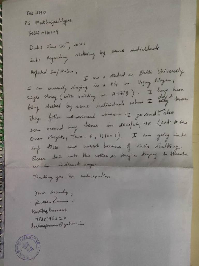 Stalking Complaint Made on June 20th, 2021 in the Mukherjee Nagar Police Station, New Delhi.